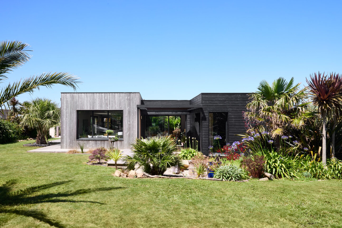 Le projet : une maison plain-pied à volumes cubiques imbriqués, caractérisée par un jeu de bardages bicolores en façade, un patio central et de larges surfaces vitrées. Un cahier des charges exigeant qui mobilise pleinement l’outil de production et le bureau d’études Murébois.